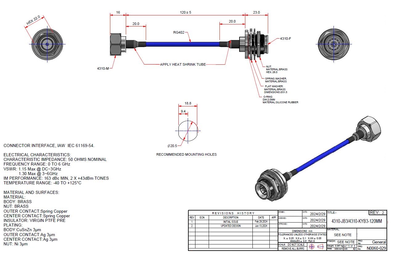 DC - 6 GHz 4.3-10 Male to 4.3-10 Female Low PIM Cable Assembly, 300 mm RG-402 DATA SHEET..